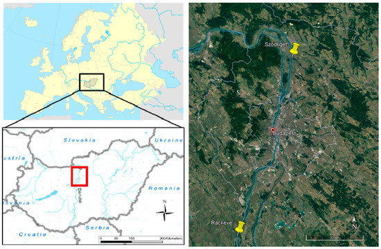 Case study areas in the Hungarian section of the Danube River at the settlements near Sződliget (north of Budapest) and Ráckeve (south).