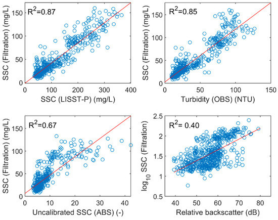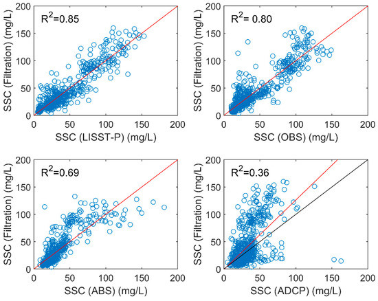 For a better understanding, the indirectly measured values related to the reference values are plotted in Figure 3. For instance, the “PBIAS can give a deceiving rating of model performance if the model overpredicts as much as it underpredicts, in which case PBIAS will be close to zero” [55] (p. 10) even though the prediction is not very good. This is the case with the LISST-ABS and the turbidimeter. The LISST-ABS, in general, tends to overpredict the SSC, while in the high SSC range (above 100 mg/L) this changes to underestimation. In the case of the turbidimeter, over and underestimation is balanced evenly. Although there are evidently more underestimated values, they are balanced by higher deviation in the overpredicted values. In contrast, the LISST-Portable|XR provides a relatively good prediction of actual SSC, just a slight overestimation can be observed, but the PBIAS value is higher than the PBIAS of the previously discussed methods. The unsatisfactory PBIAS of the ADCP is supported by the graphical visualisation—the calibrated SSC values clearly overestimate the observed SSC values.