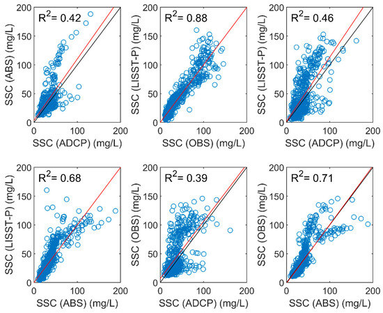 The LISST-ABS and the LISST-Portable|XR were compared in [49]. The study site was selected in the Budapest area of the Danube which is located between the two study sites of this study. However, they covered a relatively narrow SSC range (~120–170 mg/L) with 40 samples, and we could extend the relationship between the two methods in a wider range (10–150 mg/L), based on the analysis of 621 samples with similar R2 (R2 = 0.57 [49] and R2 = 0.68).