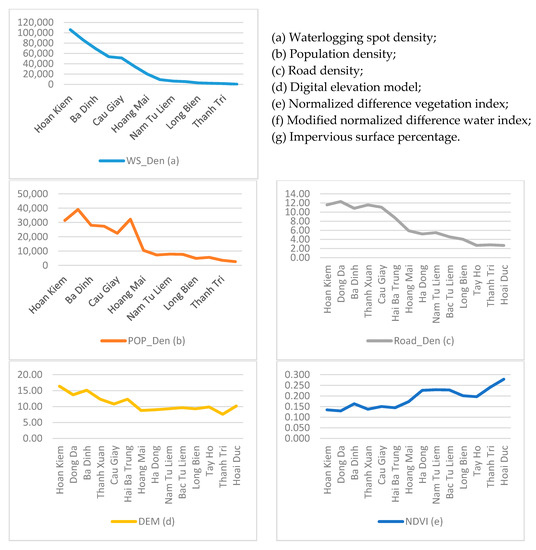 In general, urban waterlogging surpasses the capacity of the urban drainage system, and thus waterlogging disasters happen. Compounding this fact are the city’s pump stations operating beyond their capacities and Hanoi’s outdated underground drainage system being rendered inoperative when rainfall is higher than 100 mm/hour [17]. In addition, as the study area is 454.9 km2, the variation in precipitation can be limited. Therefore, this study did not consider precipitation, pump stations, or underground drainage systems, but was instead focused only on six spatial factors, namely, population density (POP-Dens), road density (Road-Dens), distance from water bodies (DW-Dist), impervious surface percentage (ISP), normalized difference vegetation index (NDVI), digital elevation model (DEM), and impervious surface (IS) of urban surfaces, to explain the urban waterlogging risks (Figure 3).
