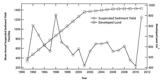 The direct consequence of urbanization on suspended sediment is often difficult to quantify due to the nonlinear relationship that exists between the two variables. In the case of the Cuyahoga watershed, the relationship is equally difficult to establish. However, based on the overall trend of both variables (Figure 5), while land development showed an increasing trend throughout the period of study, the mean annual suspended sediment only increased from 1991 to 1996. Further, with the exception of the unusually high suspended sediment yield in 2011, the suspended sediment yield has an overall decreasing trend over the two decades studied.
