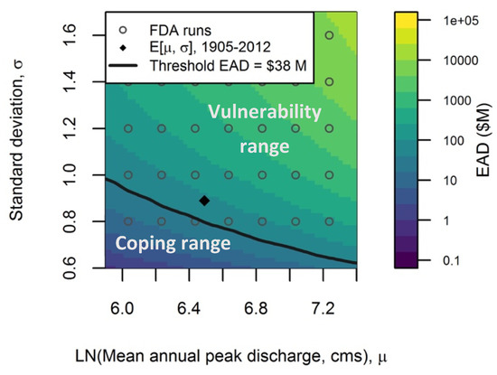 21]. Focusing on the specific management decision or policy at hand, bottom-up approaches scale and tailor climate information to inform that decision, usually through a sensitivity and vulnerability analysis. We began our analysis with a sensitivity and vulnerability assessment that does not consider climate projections, but is intended to help water managers better understand the hydrologic conditions that push their systems into a vulnerable state. For this bottom-up flood risk assessment, sensitivity is defined in terms of how much Expected Annual Damages (EAD) change under different climatic conditions. A system’s vulnerability to exceeding an acceptable flood risk is defined by the extent to which a system is unable to maintain EAD below a threshold risk level. As part of the sensitivity and vulnerability analyses, several studies [