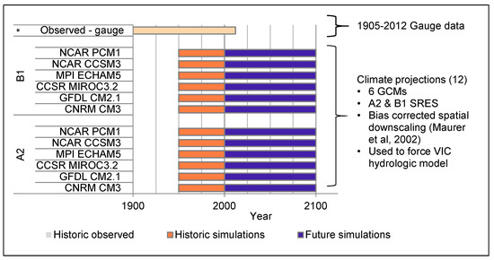 43]. We used streamflow simulations at a VIC index point on the American River at Folsom Dam, 11 km upstream of Fair Oaks and without significant inflow/outflow between the two locations. VIC output from 1950 to 1999 represent a forcing of the GCMs with observed atmospheric variables, downscaled and input into the hydrologic model. For the future time period (2000–2100), each GCM was forced with two climate change emissions scenarios (A2 and B1), totaling twelve sets of daily streamflow projections from 1950 to 2099.