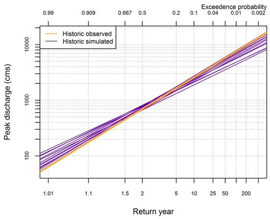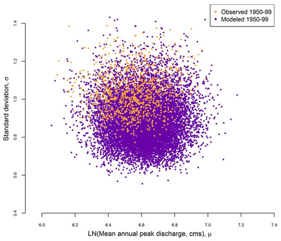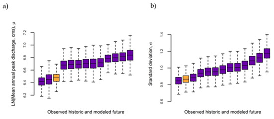 48]. As a result, while we examined a 30-year moving average of the μ and σ of the peak discharge to investigate historical trends, results remain highly uncertain.