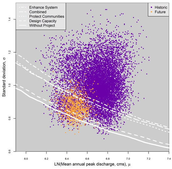 To assess the sensitivity of the current flood management system to different climates, we first developed a climate response function that describes the relationship between EAD and log-normal flood frequency curve parameter sets of μ and σ for the peak 3-day average discharge at Fair Oaks gauge. The mean daily unregulated inflow at Folsom Dam is one of the primary determinates of downstream flood risk, as there are no major inputs or outputs between Folsom and the City of Sacramento. We calculated EAD with a modeling suite that included the CVFPP using the USACE Hydrologic Engineering Center’s Flood Damage Assessment software (HEC-FDA) [