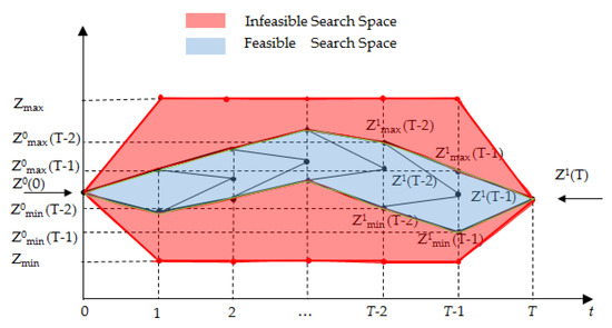 The optimized feasible search space is shown in Figure 4. Among them, Z represents the water level, the unit is meter, T represents time in seconds. Z(T) represents the water level of the reservoir during the T period, Z0 represents the initial water level of the reservoir, Zmax represents the highest water level, and Zmin represents the lowest water level.