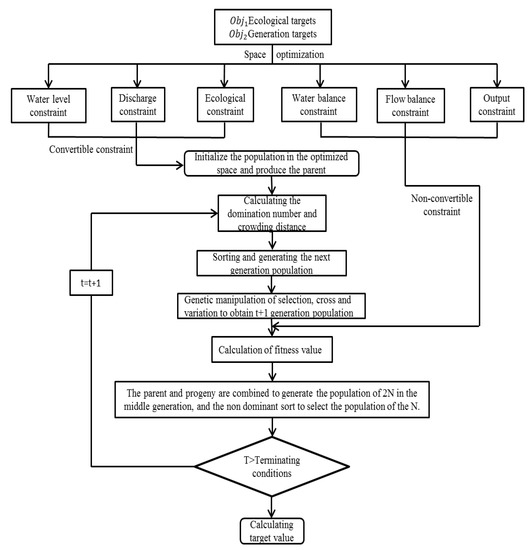 In order to improve the accuracy and efficiency of the NSGA-Ⅱ, this paper optimizes the NSGA-Ⅱ by optimizing the feasible search space. The reservoir multi-objective optimization scheduling model has a highly nonlinear characteristic, and different treatment methods should be adopted for different constraints. In this paper, the constraints are divided into the convertible constraints and the non-convertible constraints, in which the convertible constraints are used to optimize the initial search space. The convertible constraints are water level constraints, discharge constraints, ecological water demand constraints. The non-convertible constraints include flow balance constraints, water balance constraints, and power output constraints.