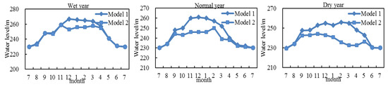 (1) The water level of each month in Model 2 is basically lower than Model 1, especially in the non-flood period of the wet year, the normal, and the dry year, and the water level of the reservoir is obviously maintained at the low water level. This is because, in order to meet the downstream ecological water storage, the reservoir needs to increase the discharge, which causes the water level to drop. Therefore, considering the ecological constraints, the water level during the water supply period of the Xiaolangdi dam during the dispatching period has been changed.