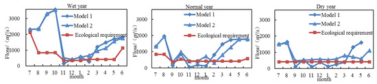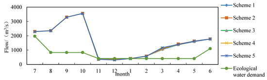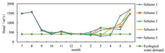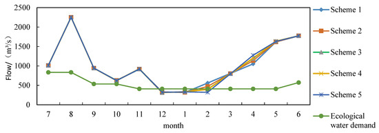 In Figure 3, the minimum ecological water requirement is the flow process needed to maintain the downstream ecosystem without degradation during the minimum water requirement. The suitable ecological water requirement during the process of water demand is the flow process to maintain the suitable habitat of the lower reaches and ensure the normal survival and reproduction of the downstream species; the maximum ecological water requirement is the flow process to maintain the balance of river scouring and deposition and to restore the capacity of river pollution.
