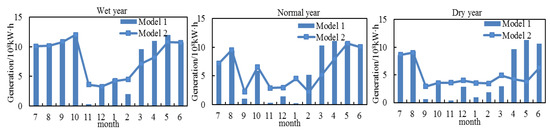 Table 4 shows the annual electricity generation and the number of eco-friendly months of different models in each typical year. As can be seen from Table 4, the monthly number of ecological guarantees in each typical year of Model 2 was increased by 2, 4, and 4 months, while the power generation decreased by 0.33, 0.86 and 1.27 billion kW·h. The ecological target has a great impact on power generation during the year and has the greatest impact on power generation in the dry year.