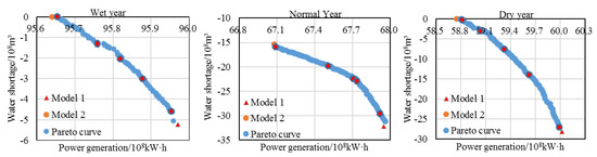 (1) The annual generation capacity of the model 1 is 9.597 billion kW·h, and the comprehensive water shortage is 0.530 billion m3, which is located at the right extreme value of the Pareto-front curve; the annual generation capacity of Model 2 is 9.564 billion kW·h, and the comprehensive water shortage is 0 billion m3, which is located at the left extreme value of the Pareto-front curve.