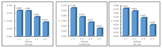 (2) Restricted by ecological constraints, the monthly outflow of the Xiaolangdi dam in Model 2 basically meets the ecological requirements. In Model 1, the discharge flow of individual months is lower than the ecological water demand and cannot meet the ecological requirements. This is because, in order to maximize the power generation, Model 1 needs to discharge as little and as much water as possible during the storage period and store it at the normal storage level as soon as possible. As a result, the amount of water discharged during the storage period cannot meet the ecological water demand. The destruction of the month occurred in the dry season. The number of damaging months is 2, 4, and 4, respectively, and the degree of damage for the wet year, normal year, and dry year are as follows.