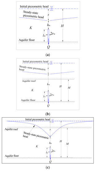 In this paper, the dewatering wells drilled upward into the overlying aquifer are called “ascending relief wells” (ARWs), and they are used to partially or completely dewater an aquifer above an active or abandoned underground mine. The ARWs can also be used in combination with pumping wells. For example, a comprehensive drainage from pumping wells and the panels was used in the 8th mining area of Taiping Coal Mine, China [17]. The ascending wells were drilled below the mining face to test hydrological parameters in many underground coal mines [11,15]. The drainage water discharged under gravity from the overlying aquifer through ARWs is collected in the underground tunnel and then pumped out through the drainage system. Schematic diagrams of the partially penetrating ARWs in an unconfined aquifer, a confined aquifer, and a confined-unconfined aquifer are shown in Figure 1.