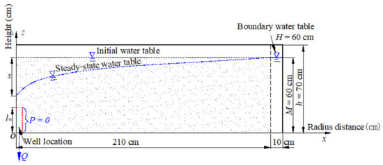 Laboratory sand-tank axisymmetric radial water flow experiments were conducted to investigate the seepage to the ARW in an unconfined aquifer. The outer boundary head was at the elevation of 60 cm and kept constant for the entire test. The water entering the ARW was discharged freely under gravity, and the piezometric head inside the ARW was zero. The boundary conditions are shown Figure 2. The sand-tank model is generally a downscaled model of the aquifer [55].