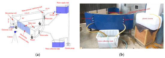 The tank was fabricated from steel plates and acrylic sheets, representing a 60° sector, i.e., a 1/6 portion of a circular flow system for saving experimental materials, with a radius of 210 cm and height of 70 cm. A design schematic and a photograph of the sand-tank assembly are shown in Figure 3. The outer boundary water head was maintained at the elevation of 60 cm above the bottom of the sand-tank, and water was supplied into the sand-tank from a plastic cistern. The outflow from the sand-tank was monitored by an electronic scale. The overflowing water and the well discharge were collected in separate water collection vessels for cyclic utilization. To measure the hydraulic pressure, 96 piezometers with water-level monitoring tubes were installed in six layers at different elevations and distances from the modeled ARW well. The inside diameter of the piezometers was 4 mm, shown in Figure A1 (see Appendix A). The piezometer storage effect is irrelevant because steady state water levels were measured. Water levels in the piezometer tubes were recorded using a camera, which is shown in Figure 3a.