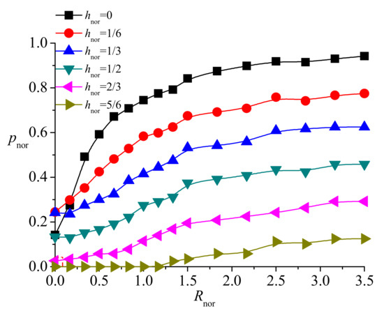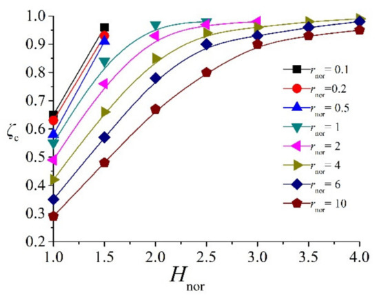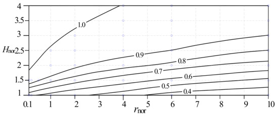 A summary of the calculations from the results of numerical simulation scenarios is presented in Table A2 and Figure 14. Figure 14 shows that increases with Hnor for different rnor, according to the relationship given by: