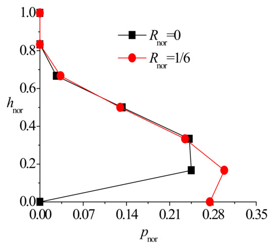 Piezometric head pnor distribution at radial distances Rnor of 0 and 1/6 for the case of rnor = 4.5 and lnor = 1/30 in the laboratory experiment.
