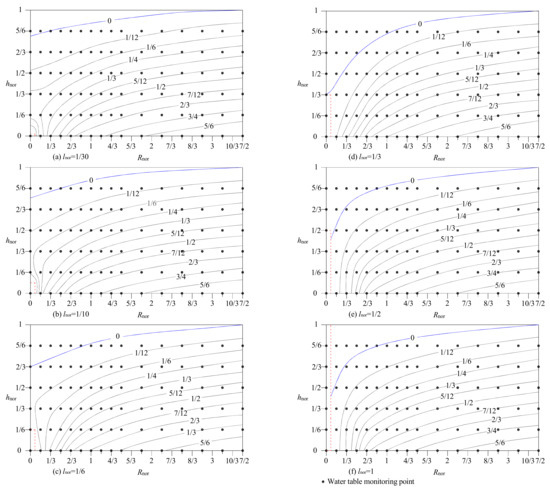 Figure 13 depicts the flow net composed of streamlines and equipotential lines for the boundary head of Hnor = 1 and rnor = 1.0. The flow net indicates that the equipotential lines above the ARW are concaved in the vicinity above the ARW. The curvature of the arched shape equipotential lines gradually increases with the well length increase, and when the equipotential line intersects the water table line, the equipotential line bifurcates into two lines, symmetrically distributed around the ARW. When the ARW’s degree of penetration of exceeds the critical value of , the equipotential lines are symmetrically distributed around the ARW. The streamlines shown in Figure 13 indicate that a single ARW can drain the entire aquifer regardless of the degree of penetration, and even for the degree of the penetration less than , groundwater flow from the entire aquifer thickness is directed into the ARW.