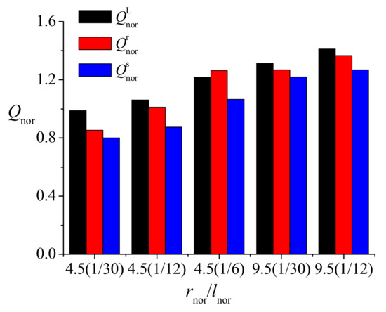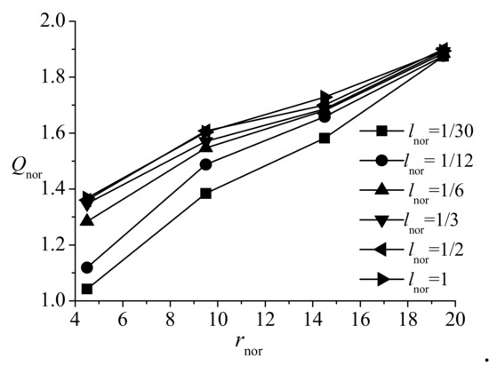 Figure 8 demonstrates that the seepage flux (Qnor) increases asymptotically with the increase of the degree of penetration lnor, which can be described by an exponential relationship (with R2 > 0.96) given by: