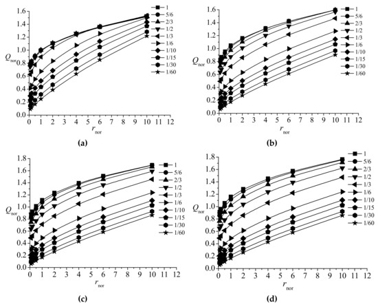 Relationships between the seepage flux Qnor and the well radius rnor for different boundary conditions: (a) Hnor = 1, (b) Hnor = 2, (c) Hnor = 3, (d) Hnor = 4.