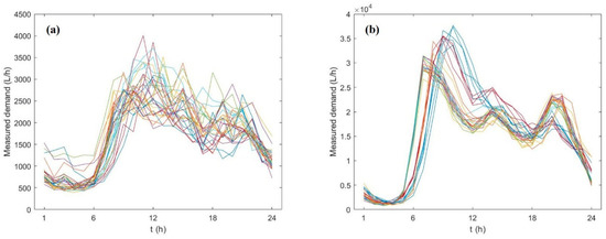 The daily patterns of aggregated measured hourly demand in the 31 days considered in both case studies are shown in Figure 1, highlighting similar characteristics of water consumption in the network.