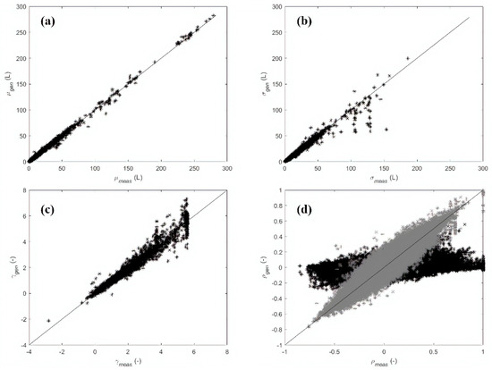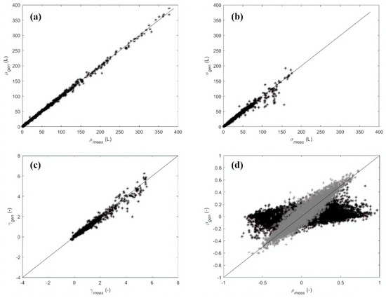 Case study 1 (Application 2)—Comparison between measured and generated hourly demands at single node level: (a) mean values , (b) standard deviation values , (c) skewness , (d) rank cross-correlations (black) and (gray).