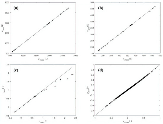 Case study 1 (Application 2)—Comparison between measured and generated aggregated hourly demands: (a) mean values , (b) standard deviation values , (c) skewness , (d) rank cross-correlations .