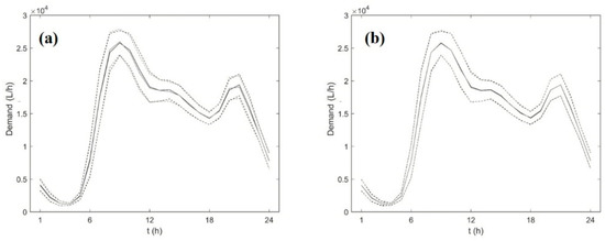 For explicatory purposes, the graphs in Figure 6 report, for measured and generated aggregated demand time series, the daily temporal patterns of mean μ and their intervals ± 0.5 for both the procedures in Application 2. The means for the measured demand time series were obtained starting from the aggregated measured demands, while those for the generated demand time series are the average values over 500 generations. However, these graphs constitute further evidence of the goodness of the fit at aggregated scale for both procedures.