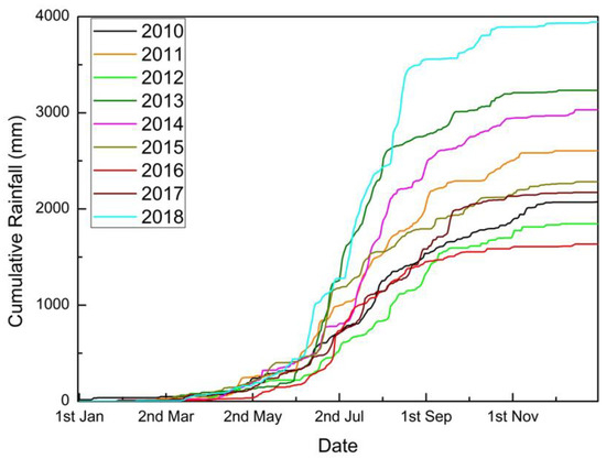For threshold analyses, the starting point is the collection of rainfall and landslide data [27,35]. Concerning rainfall, despite some recent advances relying on radar measurements, rain gauge is by far the most commonly used method of measurement in threshold analysis [35]. Therefore, rainfall data with the best possible temporal accuracy (daily time steps) were collected from 4 rain gauge stations maintained in the area by the India Meteorological Department (IMD) [46]. The data from 2010 to 2018 are used to carry out the analysis for Wayanad district. The locations of the rain gauge stations are Mananthavady (R1), Vythiri (R2), Ambalavayal (R3) and Kuppadi (R4). The annual cumulative rainfall during the study period is shown in Figure 4. Maximum rainfall was observed in the year of 2018 with a cumulative rainfall of 3832 mm.