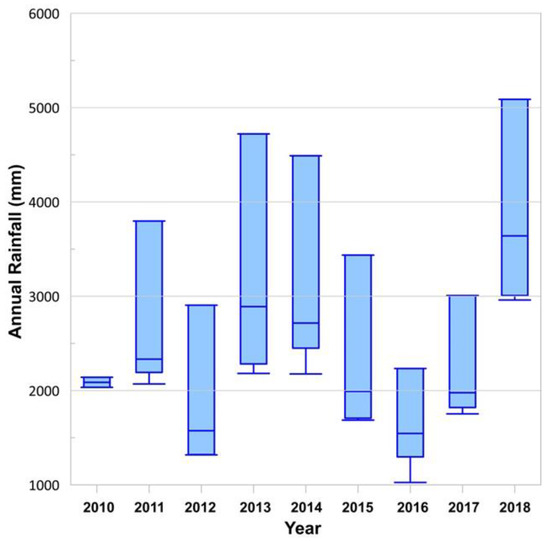 Box and Whisker plot showing the variation of annual rainfall across the four rain gauge stations.