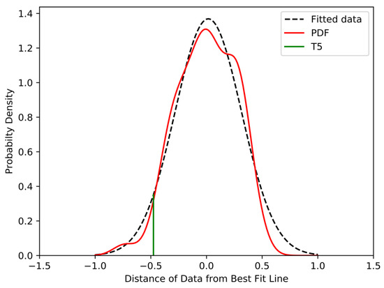The data are found to follow a distribution similar to the standard Gaussian distribution. The Gaussian fit of the probability density function is shown in Figure 7 as the dotted line. The threshold lines of different exceedance probabilities were calculated using the fitted distribution of δI. The distance Δ between the best-fit line and the T line is used to calculate the intercept of threshold line in the log vs. log plot. An exceedance probability of 5% indicates that the probability of occurrence of landslides below this threshold is less than 5% [34]. The threshold of 5% exceedance is plotted according to the shift Δ.