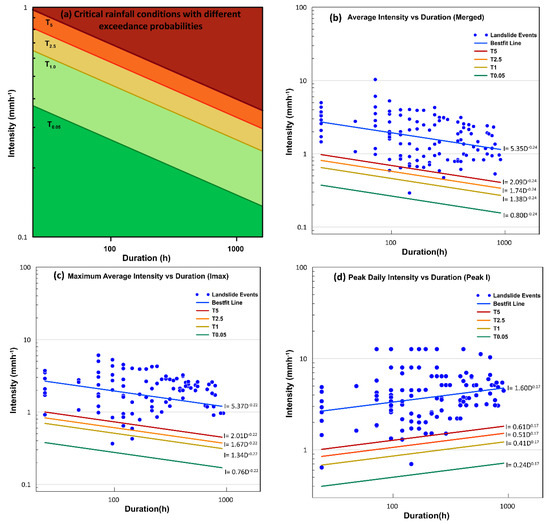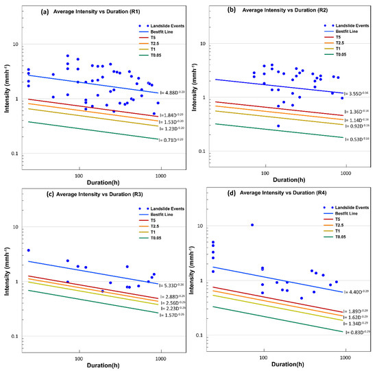 According to Caine [24], intensity–duration thresholds are defined as a power-law in the following form: