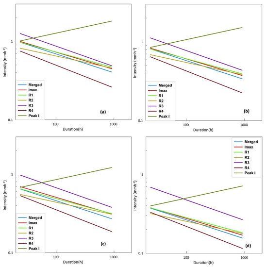 From Figure 10, it can be observed that for all exceedance levels, the relative positions of all the defined thresholds follow a similar pattern. Peak I and R3 thresholds are much higher than all the other thresholds. At lesser durations, Peak I thresholds are observed to be lower than R3 and the reverse is observed during higher durations. R4 thresholds are the lowest in all cases, as the region is characterized by less intensity rainfalls. R2 thresholds are conservative at lesser durations, but as the duration increases, the threshold curve crossed merged, Imax and R1 thresholds. R1 thresholds are observed to be in close similarity with the Imax values as at some exceedance probabilities, R1 is higher than both Imax and merged thresholds and generally at higher durations, the threshold becomes more conservative. The Imax thresholds are always higher than that of the merged thresholds with similar values at low durations. The shift between the two threshold lines increases as the duration increases.