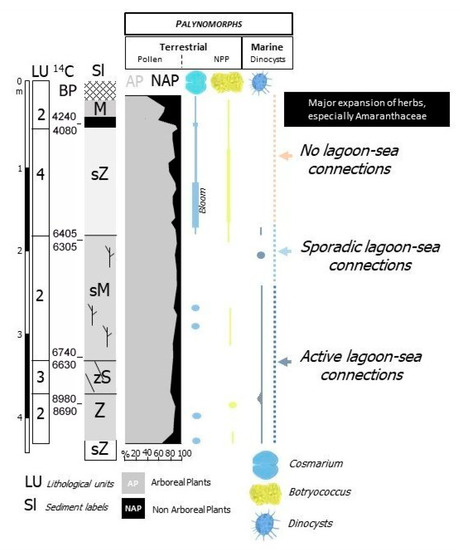 - Lacustrine Holocene facies (LH)—It corresponds to the whitish CaCO3 enriched Unit 4. The faunal component is essentially made up of freshwater gastropods and freshwater/low brackish ostracods. NPPs as a whole, confirm a prevalent freshwater environment; indeed, the main components of the NPPs assemblages are Cosmarium, indicative of prevalent freshwater conditions and Botryoccoccus, which thrives in fresh–brackish waters. Notably, their abundances (especially that of Cosmarium) indicates a bloom around 5770 year BP (in BU1). Such bloom may indicate a sudden change in one or more environmental parameters such as nutrients (e.g., phosphorus and nitrogen), temperature or pH. It is also necessary to understand if the phenomenon was natural or anthropic-induced. Cosmarium and Botryococcus proliferate in oligo-to mesotrophic conditions, and therefore a sudden eutrophication episode can be excluded. The absence of other taxa such as Pediastrum, aquatic algae commonly present in freshwater habitats rich in mineral and organic nutrients confirms the oligotrophic conditions. Desmids are sensitive organisms and act as an indicator of water quality, concentration of chemical oxygen demand, nitrate and turbidity; Botryococcus can dominates (or be present) in relatively extreme environments which prevents for example the occurrence of Pediastrum; it is often present when water is clear, oligotrophic, eventually dystrophic [74,75,76]. All this evidence permits to define a freshwater depositional basin with clear and oligotrophic waters. Moreover, the abundance of calcite suggests medium-high pH waters and probably microbially induced calcium carbonate precipitation a phenomenon also associated with the so-called “Whitings” (e.g., [77,78]). The development of this facies starts after 6 ka BP and ends at about to 4 ka BP. The origin of this facies is not clear at present. Due to the absence of significant river inputs, it might assume a rise of fluids linked to the late hydrothermal phases of the Vulsino volcanism. Similar evidences were observed in the Specchio di Venere lake, a coastal basin in the volcanic island of Pantelleria (southern Sicily) [79].