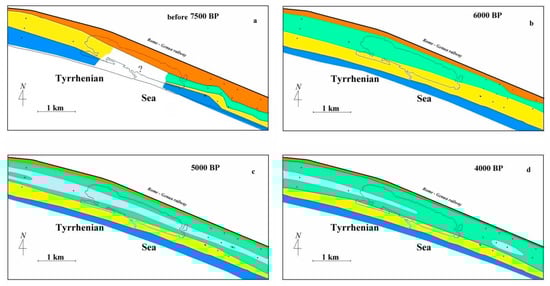 - Bellotti, P.; Calderoni, G.; Di Rita, F.; D’Orefice, M.; D’Amico, C.; Esu, D.; Magri, D.; Preite Martinez, M.; Tortora, P.; Valeri, P. The Tiber River delta plain (central Italy): Coastal evolution and implications for the ancient Ostia Roman settlement. Holocene 2011, 21, 1105–1116. [Google Scholar] [CrossRef]
