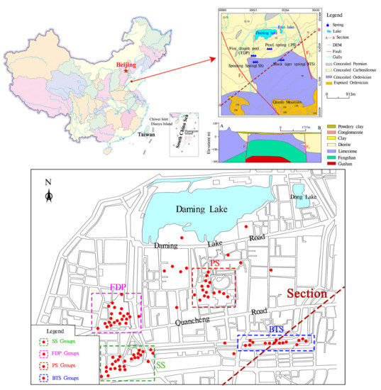 Hosting large reservoirs of groundwater, karst aquifers are of great significance in coordinating the balance of water environment and human needs [1,2]. Jinan is famous for numerous karst springs. Spring water is a good “city card” for the city and served as a history and culture carrier [3,4]. The four most famous spring groups are including Five Dragon Pool (FDP), Pearl Spring (PS), Spouting Spring (SS), and Black Tiger Spring (BTS). The development of karst in the Jinan spring area is a typical representative of the karst spring system in northern China. Karst groundwater resources are abundant, due to their unique geological-hydrogeological conditions and monoclinic geological structure characteristics [5] and have always been the main source of water supply for industry, agriculture, and domestic use in Jinan area. Therefore, these groundwater resources are considered as an important resource for social and economic development. However, with the construction of urban modernization, spring water resources have been seriously damaged and polluted [6,7,8,9,10,11]. With the acceleration of industrialization and urbanization, the exploitation of karst water has been increasing, since the 1980s. Furthermore, human activities have polluted groundwater to a certain extent, resulting in the detection of industrial and living pollutants in groundwater, with a gradual increase in the degree of pollution. Current literature research suggests the chemical composition of spring water has a continuous upward trend and the quality of spring water becomes worse year by year [6,10,11,12]. During recent years, extensive work has been done to protect Jinan spring water, including studies on hydrochemistry, water quality, and dynamics of spring water, which shows the importance of Jinan spring water as well as the attention required for its protection [13]. However, relatively few comprehensive studies exist on the hydrochemistry and flow dynamics of Jinan spring water. Lu et al. [10] determined the evolution of karst water quality in the Jinan spring area and its response to human activities. Yang et al. [8] discussed the impact of major engineering constructions on Jinan spring water and surrounded areas. Based on the groundwater table dynamics and precipitation data of the Jinan spring area, Qi et al. [14] analyzed the multi-time scale characteristics, correlation, and response of groundwater table dynamics of Jinan spring area to precipitation, using wavelet transform method. Zhou et al. [15] analyzed the chemical characteristics of karst water in the Jinan area and evaluated the water quality. Yin et al. [5] investigated the hydrochemistry and environmental isotopes of spring water in the Jinan spring area, through combining the actual hydrogeological conditions of the karst spring area. Xing et al. [3] studied the mixing ratios of spring water recharge sources in the Jinan, through the analysis of spring water level, tracer test, hydrochemical data, and karst development degree and suggested the presence of seasonal differences in spring water recharge sources.
