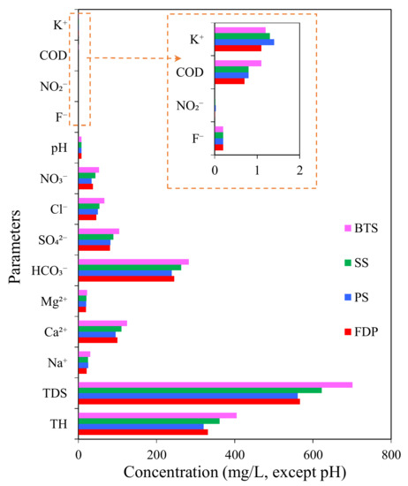 Based on the comparison between the four spring groups, except for the similar value of F− and pH, the chemical components of the four spring groups are different. Among them, the average concentrations of TDS, TH, Ca2+, HCO3−, and NO3− present an order of BTS > SS > FDP > PS, while Mg2+, Cl−, SO42−, and COD demonstrate an order of BTS > SS > PS > FDP, while K+ follows the order of PS > SS > BTS > FDP (Figure 3 and Figure 4).