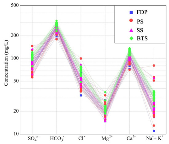 Schoeller diagram is a commonly used method for hydrochemical characterization, which can clearly show the changes in the concentration of major ions, in water samples [26]. According to the Schoeller diagram, obvious differences are observed in the main ion concentration of each spring group. Meanwhile, the same trend is observed for the water sample curves of the four groups, with a slight difference at individual water sample points, indicating the same source of recharge for these four groups.