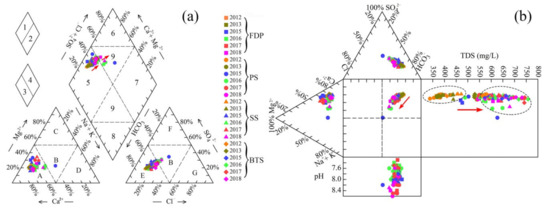 TH and TDS are considered as significant parameters for evaluating water quality suitability [22]. The four spring groups of FDP, PS, SS, and BTS has an average TDS concentration of 566.60 mg/L, 561.14 mg/L, 622.11 mg/L, and 701.01 mg/L, respectively, and the average TH concentrations of 331.47 mg/L, 320.47 mg/L, 361.51 mg/L, and 404.55 mg/L, respectively (Table 1). Based on the TH and TDS, the water quality of the four spring groups for the duration of March 2015 to July 2018 is excellent. NO3− can usually reflect the impact of human activities, such as industrial and agricultural production, on groundwater [23]. The mean NO3−concentrations of FDP, PS, SS, and BTS are 37.47 mg/L, 33.80 mg/L, 43.44 mg/L, and 52.60 mg/L, respectively (Table 1). Among them, only the mean NO3− concentration of the BTS exceeds the WHO drinking water standards (i.e., 50 mg/L), however, the value does not exceed China’s national standards for drinking water (i.e., 88.57 mg/L) [24]. Other major ions, such as Cl−, SO42−, Na+, and F− are lower than the WHO standards [25].