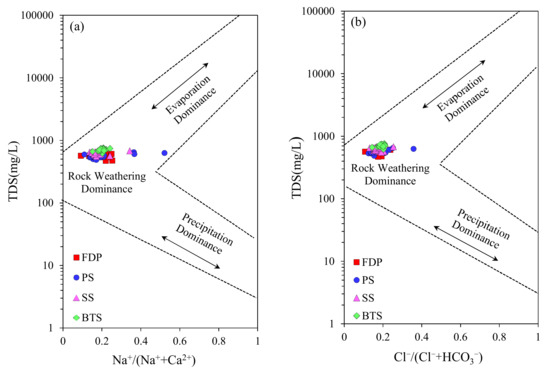 Generally speaking, rock weathering, atmospheric precipitation, and evaporation are three important factors, affecting the groundwater hydrochemistry in non-coastal areas. The Gibbs’s model diagram [31] can identify the dominant controlling factors of hydrochemistry. In this study, all the spring water samples, collected from the four spring groups, fall into the rock weathering dominance zone (Figure 6), indicating that water–rock interaction plays a significant role in the spring water chemistry.