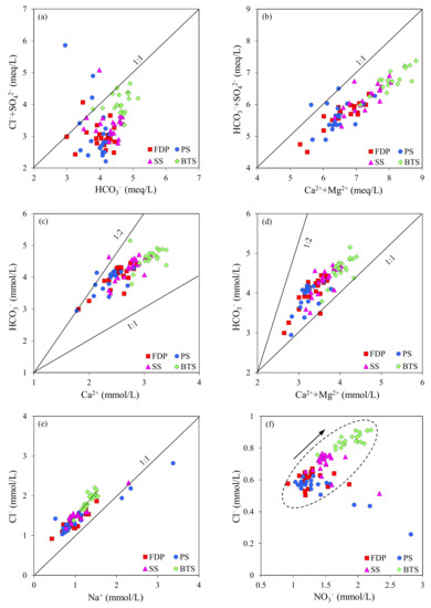 The ratios of major ion can help to further understand the types of rock weathering sources related to the hydrochemical characteristics of groundwater [32,33,34]. As presented in Figure 7a,b, most water samples are concentrated in the zones below the y = x line, which indicates that the water chemistry of the samples is affected by the dissolution of carbonate minerals, which provides the main source forCa2+, Mg2+, and HCO3− in the spring water. In addition, most of spring water samples are plotted in the zones between the y = x line and y = 2x line, but in Figure 7c the water samples are close to y = 2x line, while in Figure 7d, samples are inclined to y = x line, indicating that the spring water chemistry is mainly affected by the dissolution of calcite, followed by the dissolution of dolomite. Most spring water samples fall above the dissolution line (y = x line) of the halite (Figure 7e), indicating the dissolution of halite is not the source of Na+ and Cl−. Except for a few water samples, Cl− contents in most water samples of the four spring groups increase with the increase of NO3− (Figure 7f), which suggests a certain impact of human activities on spring water, in the study area.