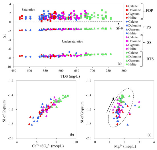 (a) SI for calcite, dolomite, gypsum, and halite, (b) plot of SI of gypsum versus (Ca2+ + SO42−), (c) plot of SI of gypsum versus Mg2+.