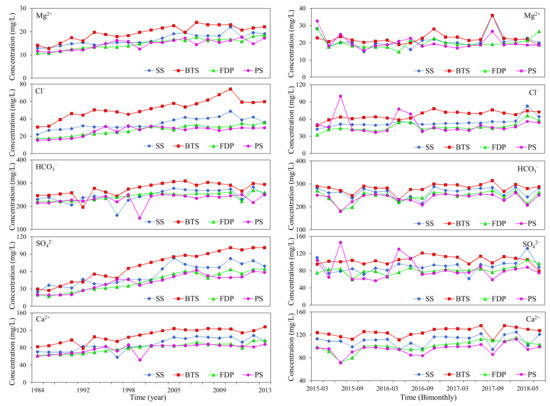 Regarding Mg2+, the concentration of Mg2+ in spring water of the four spring groups gradually increases, before 2006, while the growth rate slows down significantly, between 2006 and 2013. As for Cl−, overall, the Cl− content shows a gradual increase before 2010 and increase slowly after 2010 (Figure 9). The concentration of SO42− in spring water shows the characteristics of continuous increase. In addition, the concentration of SO42− in PS spring water has obvious fluctuations. Ca2+ content presents a gradual increase before 2005, followed by a slow increase. The contents of Na+ and Cl− in the four spring groups also show a slow upward trend, between 2015 and 2018.