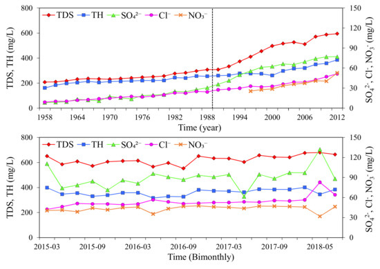 In addition, we gathered data on TDS, TH, SO42−, and Cl− in SS from 1958 to 2012, through previous studies [4]. Combined with the sampling data, collected in this study, we suggest the changes in the content of these chemical components in spring water from 1958 to 2012 can be divided into two stages (Figure 10). Before 1990, the content of each component is low, with a slow upward trend. From 1990 to 2012, the contents of each component in spring water increase, rapidly. However, the chemical composition of SS spring water is stable, from 2015 to 2018. The four spring groups are located in the urban area of Jinan, with a relatively close distance between the spring groups, suggesting the same source of recharge. Therefore, considering the chemical composition analysis of the SS, the chemical composition of the spring water of four spring groups from the 1960s to the present has experienced three phases of slow increase, increase, and stability.