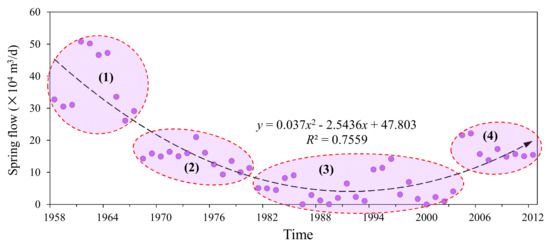 From 1958 to 2012, the spring water flow in Jinan has changed continuously, showing four different stages (Figure 12), as follows: