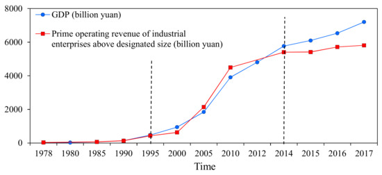 As the Jinan spring groups are located in the urban area of Jinan, their runoff area and direct supply area are mostly urban built-up areas [8]. The rapid development of the economy has resulted in stronger and more intensive human activities, which has put tremendous pressure on the groundwater environment. Therefore, the variation of chemical characteristics of spring water in Jinan is closely related to the intensity of human activities [6]. As shown in Figure 13, since the 1980s, the gross domestic product (GDP) and the prime operating revenue of industrial enterprises, above designated size in Jinan, have been divided into three stages including slow growth, rapid growth, and growth. This corresponds to the temporal variation of chemical components in spring water, indicating that human activities are the main factor, affecting the chemical variation characteristics of spring water in Jinan. In addition, excessive exploitation of groundwater and changes in land-use patterns have changed the dynamic conditions of groundwater, accelerating the transportation of pollutions from contaminated rivers and sewage to groundwater, hence affecting the quality of spring water.