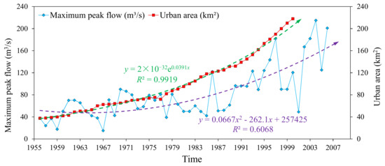 Relationship between urban land area and annual maximum flood peak flow in Xiaoqing River Basin of Jinan.