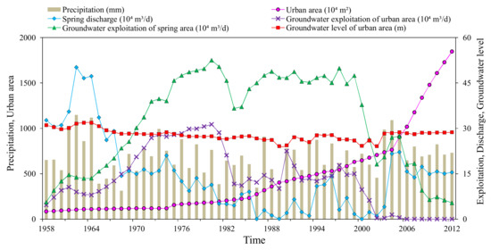 In addition, some hydrochemical data were collected from previous studies [3,4,5,10]. Furthermore, information about spring flow (1958–2012), urban area (2000–2015), precipitation (1958–2012), groundwater exploitation (1958–2012), and maximum flood peak discharge (1956–2006) were provided by Shandong Geological Environmental Monitoring Station and Shandong Institute of Geological Survey.