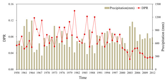 Under natural conditions, the DPR value is the ratio of spring water flow to precipitation. The multi-year dynamics should be relatively stable. Under exploitation conditions, the total groundwater discharge includes the groundwater withdrawal and spring water flow. If the recharge conditions remain the same, the DPR value should also be stable, however, it is not the case (Figure 17). As shown in Figure 17, the DPR value fluctuates between 0.05 and 0.10 before 2000, with a maximum of 0.14, and maintains a relatively stable trend. When the annual precipitation is high, the DPR value is small, and vice versa. This coincides with the fact that the surface runoff of the spring area is high when the precipitation is high, with a non-linear relationship, which is due to the limited storage space of the groundwater. However, after 2000, smaller values of DPR observed, i.e., less than 0.05, with a gradually decreasing trend. It indicates that the recharge conditions of precipitation to groundwater have deteriorated, indeed, the ground hardening in the recharge area has reduced the recharge of groundwater in the spring area, under the same precipitation conditions.