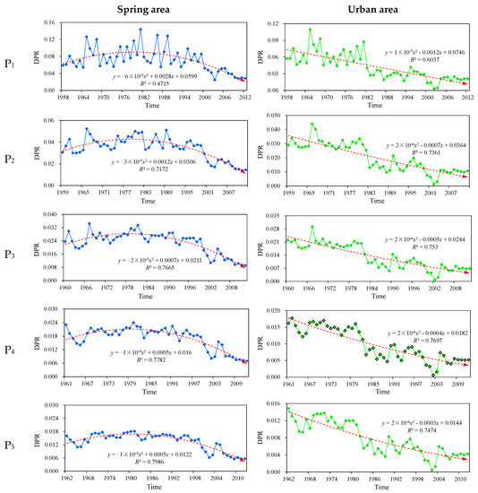 (2) According to the dynamic changes of DPR in the spring area, before 2000, the DPR value shows an initial increase, followed by a decrease, which indicates that the exploitation of groundwater can increase the recharge of precipitation to groundwater, i.e., “recharge increment” [41]. However, after 2000, a sudden decrease trend is observed, causing the ground hardening in the recharge area, which results in the decrease of groundwater recharge by precipitation.